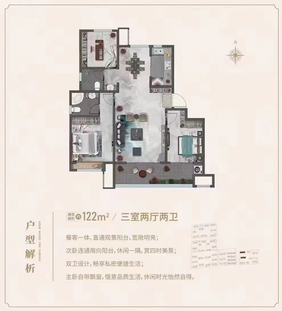 楼栋:C5-6# 面积:122㎡ 总高:11层 户型:三室两厅两卫 梯户:2个单元1梯2户 公摊:17.42% 交付标准:毛坯