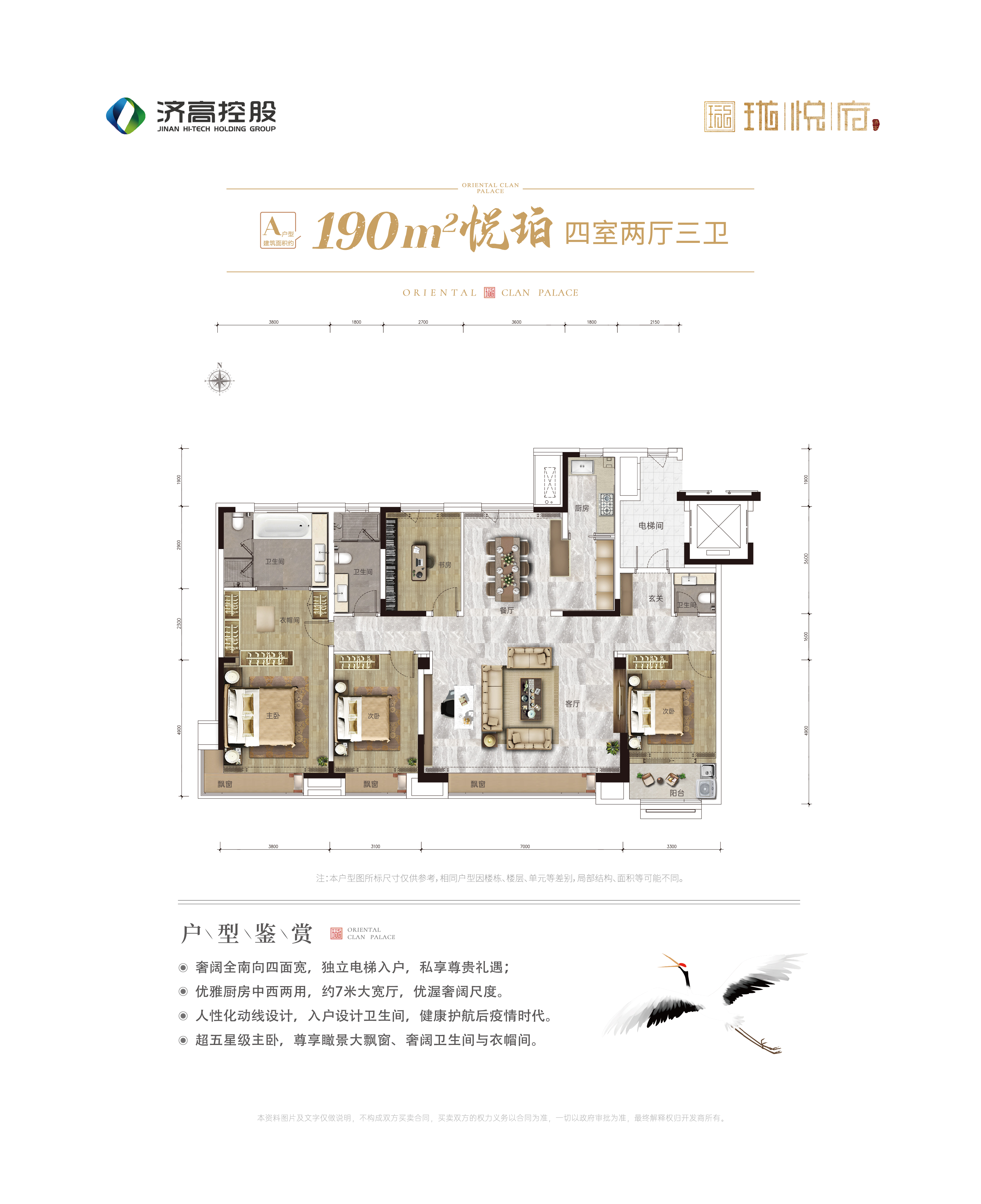 建面约190㎡ 悦铂 四室两厅三卫 约17.2米超大面宽,南向四开间,世家生活主场 入户毗邻卫生间,护航后疫情时代,方便老人起夜 约7米超大面宽厅,与餐厅、吧台一体,中西合璧 约38㎡奢阔主卧,容纳洄游式衣帽间、奢华卫生间(含浴缸)