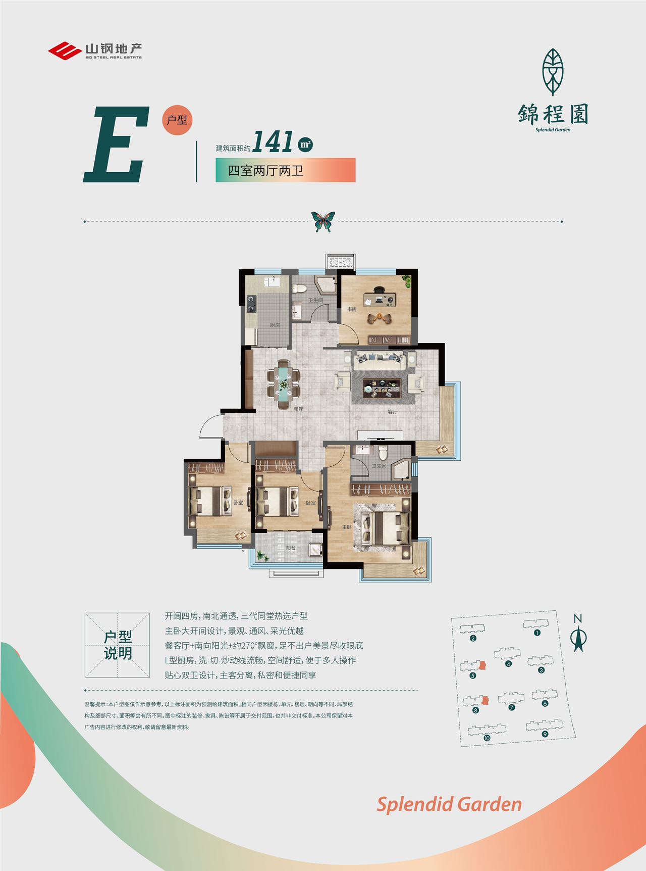 项目规划建设用地面积为37259㎡,总建筑面积为118919㎡,地上容积率2.4、建筑密度为16.23%,绿地率39.95%。项目规划10栋住宅,其中,其中15-18层小高层8栋,中央楼王24层,户型面积105-140㎡,房源共782套;规划商铺472㎡,地下车位630个。