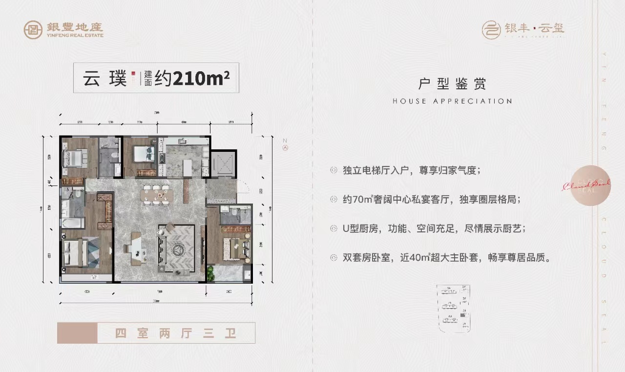 项目卖点 【历下正心?】择址历下中心,15分钟直达奥体、CBD,顶流商圈环伺; 【双轨在侧】R2/R3交汇处,唯一市区地铁换乘站八涧堡站仅400米; 【丰盈配套】历下医养结合中心,九年一贯制盛华学校,紧邻高端医疗、教育; 【绝版洋房??】历下主城唯一10层洋房,全社区1梯1户,70平超大客厅,超高得房率; 【顶级豪装】松下、劳芬等国际顶级家装交付;中央空调、新风各类家电一应俱全; 【智能科技】一线品牌智能家居系统,APP远程控制全维生活场景; 【康体园林】济南首创12大康体植被园林,380米夜光跑道,7大全龄功能景观; 【智慧家园】三重归家礼序,双精装大堂,全人车分流,面部识别0接触无感归家; 【纯粹圈层】仅286席「云玺荟」峯层业主社群,私享社交沙龙,定制健康管理; 【金牌物业】银丰物业-国家一级资质,金钥匙认证,全体业主满意度高达95%。