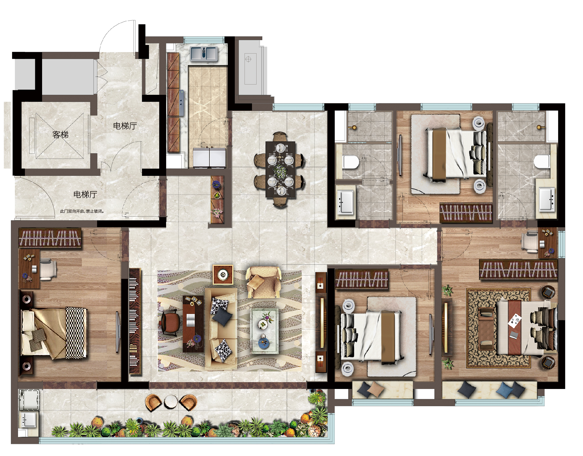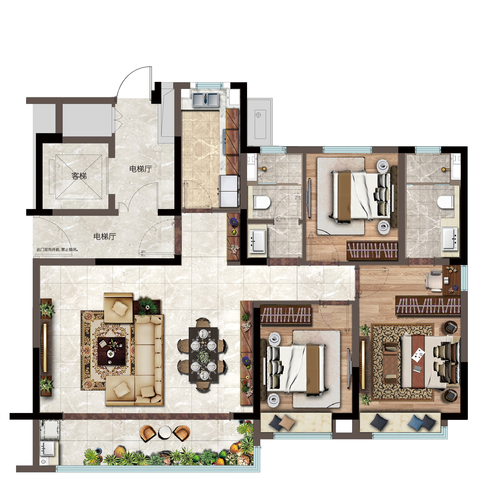 全明方正四居,动静分区私密优享; 独立玄关入户,锁住更多生活想象: 约6m朗阔开间,餐客相连便捷生活; 约10m南向奢阔阳台,写意别样景致; 主卧享独立卫生间、衣帽间,私密起居。