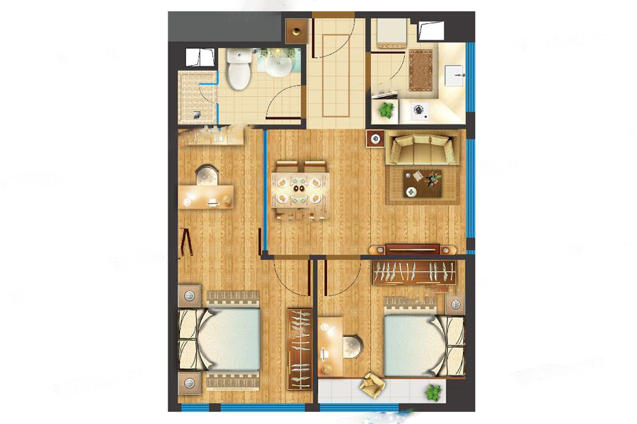 各个空间户型方正,方便室内家具布置;客厅、主卧非南向或东向,居室采光一般;户型不是南北通透,整体空间无穿堂风;卫生间没有对外窗户;比较重要的空间无对外窗户;卧室进卫生间需要穿过餐厅或客厅;卧室门朝向客厅或餐厅;客厅、卧室、卫生间和厨房等主要功能间的尺寸以及比例适中,有利于采光和通风,居住起来舒适、方