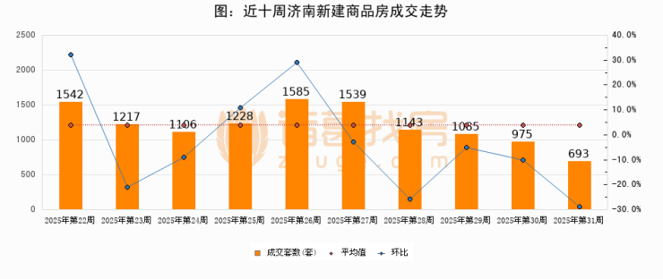 进入2025年第31周(07月28日-08月03日),济南新建商品房成交693套,较上周减少282套,环比下降28.9%。从近十周成交来看,周均成交套数为1211套,本周成交693套,低于近十周平均成交量42.8%。
