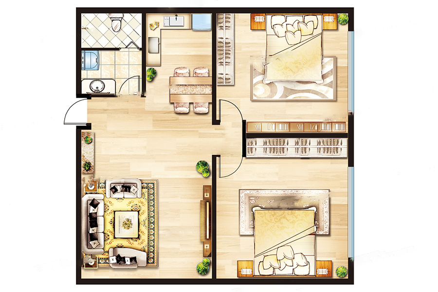 各个空间户型方正,方便室内家具布置;全明通透户型,居住舒适度较高,整个空间采光充足,利于后期居住;整个户型空间布局合理,做到了干湿分离、动静分离,方便后期生活;客厅、卧室、卫生间和厨房等主要功能间的尺寸以及比例适中,有利于采光和通风,居住起来舒适、方便;公摊高于15%且低于25%,符合住宅公摊正常范