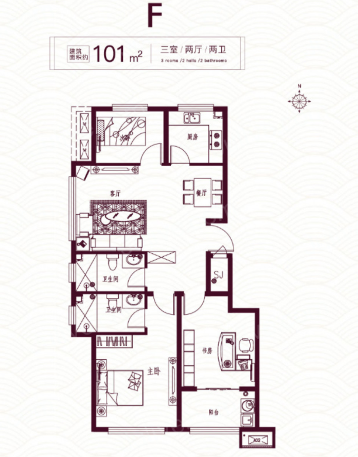 居室详解 【客厅】客厅与阳台相连,采光好,视野佳 【卧室】大主卧,配置齐全,舒适度佳 【厨房】明厨,透气性佳 【餐厅】餐厅与厨房距离近,便于食物的传递 【卫生间】明卫,不易滋生细菌 【露台】拥有阳台,便于衣物的晾晒 优势描述 1. 户型方正,空间利用率高 2. 整体空间采光好,透气佳,